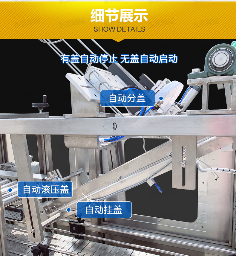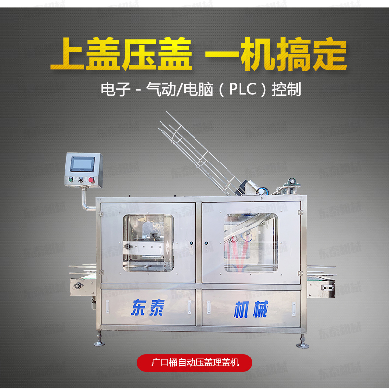 人工放蓋至料倉(cāng)——自動(dòng)剝離——自動(dòng)吸蓋——自動(dòng)掛蓋——自動(dòng)滾壓蓋——自動(dòng)出桶——一個(gè)循環(huán)完成。