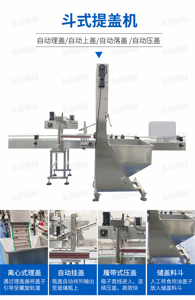 該提蓋式主要適用于制藥、食品、化工、日化等行業(yè),是自動(dòng)化生產(chǎn)線中旋蓋機(jī)、壓蓋機(jī)等的理想配套設(shè)備。采用底部添蓋替代傳統(tǒng)的手動(dòng)上蓋,使自動(dòng)化工作更加方便、快捷。特別是對(duì)于要求不能有磨損的瓶蓋如印刷好后的蓋子需要到下一步工序生產(chǎn)或者包裝等,此設(shè)備也可強(qiáng)有效的減少磨損;其工作原理是通過(guò)微動(dòng)開(kāi)關(guān)檢測(cè)的作用,通過(guò)輸送刮板,把料斗里的瓶蓋按生產(chǎn)需要?jiǎng)蛩俚乃腿肜砩w器中,確保了理蓋器內(nèi)的瓶蓋能保持在佳的狀態(tài);