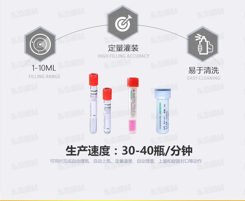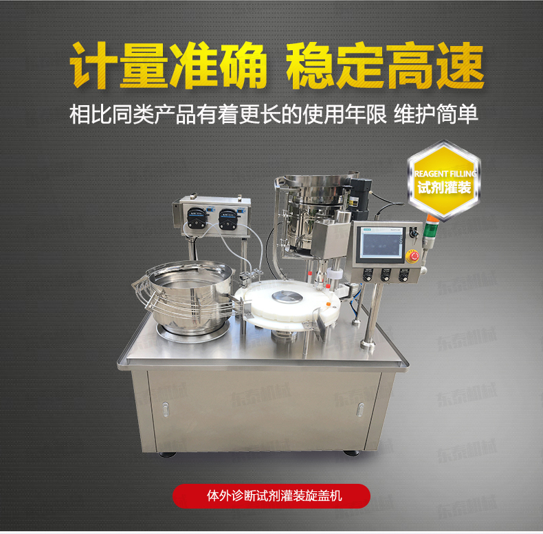 本機是在引進和吸收國外技術(shù)的基礎上,由我公司自主研發(fā)的一款I(lǐng)VD診斷試劑灌裝旋蓋一體機,能同時完成自動理瓶、自動上瓶、定量灌裝、自動理蓋、上蓋和旋蓋封口等動作。本機采用日本高精度封閉式凸輪分度工位器,精度高,運行可靠,使用壽命長。該分度器結(jié)構(gòu)簡單,長期使用無需維修。該型號設備主要用于ⅣD體外診斷試劑制藥、生物制藥行業(yè)及科研領(lǐng)域裝。機器設計緊湊合理、外形簡潔美觀,灌裝量調(diào)節(jié)方便。
