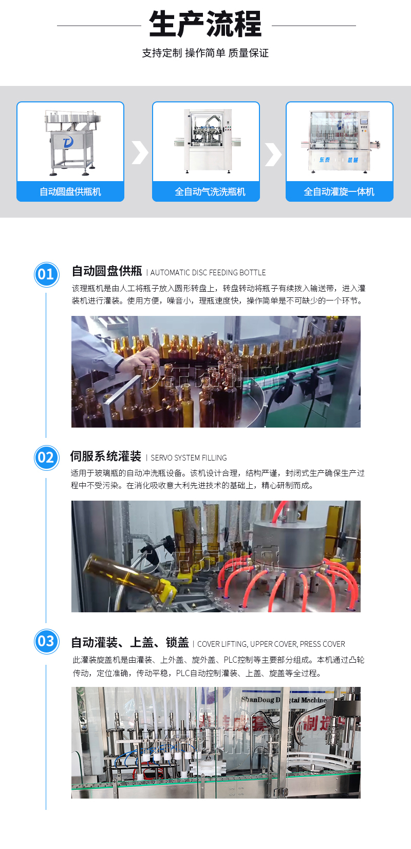 本灌裝流水線設備具有穩(wěn)定可靠、自動化水平高,相比同類產(chǎn)品有著更長的使用年限,維護簡單,整線中各設備的協(xié)調性、連貫性強,整線設計合理等特點。灌裝設備采用獨家專利系統(tǒng)結構,為當今行業(yè)內(nèi)水平,整線滿足量產(chǎn)化、集成化生產(chǎn)的需要。