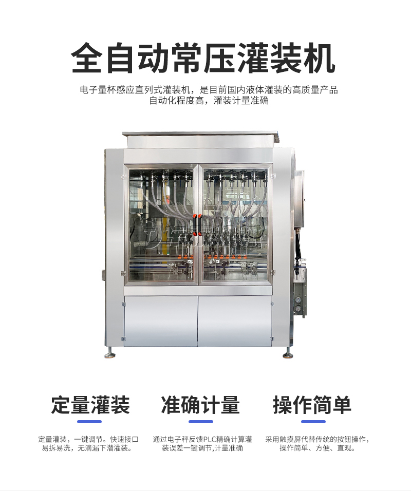 電子量杯感應(yīng)直列式灌裝機(jī),是目前國(guó)內(nèi)液體灌裝的高端產(chǎn)品,自動(dòng)化程度高,灌裝計(jì)量精確,適用于塑料瓶、玻璃瓶等各種幾何形狀的瓶型的不含氣體的酒水、飲料、調(diào)味品及其他溶液的定量灌裝。機(jī)器采用觸摸