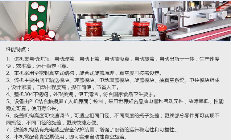 1、該機(jī)集自動進(jìn)瓶、自動理蓋、自動上蓋、自動抽吸真,自動旋蓋,自動出瓶于一體,生產(chǎn)速度快,效率高,運行穩(wěn)定可靠。
