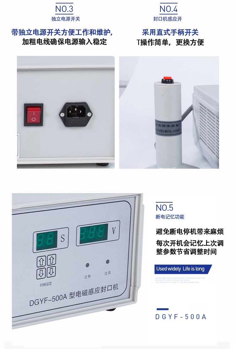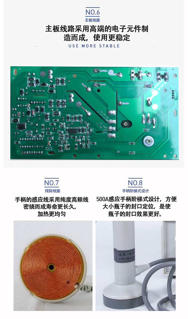 該封口機是一種便攜式電磁感應加熱封口設備,專為制藥、化工、農(nóng)藥、食品、化妝品、輕工行業(yè)對容器進行鋁箔嚴密封口。封口材質使用廣泛,可以是聚乙烯、聚丙烯、聚苯乙烯、聚酯以及玻璃瓶,但不能用于金屬瓶體及瓶蓋。本機小巧輕便,使用簡單,適用于小批量生產(chǎn)和實驗室作業(yè)。本機采用國外先進線路,選用日本最新模塊化功率器件,較于一般電子感應加熱器更省電,熱效率達到90%以上,瞬時加熱速度為后者的20-30倍,因此不僅適用于熱封性能較好的聚乙烯、聚丙烯材質的瓶體,而且對熱封性能較差的聚酯瓶、玻璃瓶也有極好的封口效果。